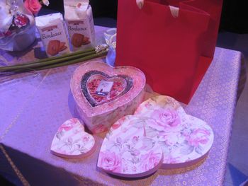 | この素敵な薔薇のハートの箱は何でしょう?「大分からぺ・ヨンジュンさんを熱く想う会」大阪、京都、東京、広島、九州の会員の心を籠めたメッセージが入れてあります。先日のソウル旅行でMiss Paddingtonさんがヨンジュンさんにこの真っ赤な手提げに入れて届けることが出来ました。これはそのレプリカです。 |  |