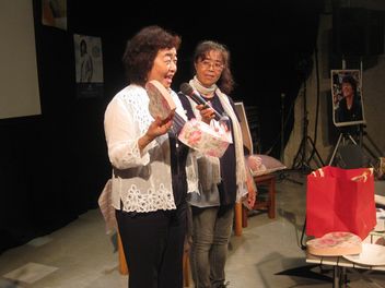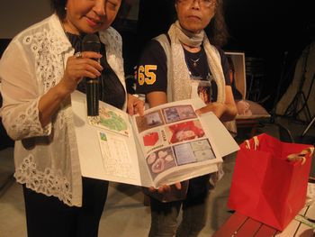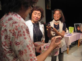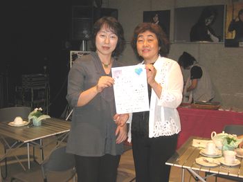| こうして、うれしい気持ちで第35回冬ソナライブを終えることが出来ました。ヨンジュンさんの「HOHOEMIプロジェクト」が発表され、これからは、私たちの募金もそちらへ贈る事が決まりました。今回のライブも「HOHOEMライブ」と副題をつけました。 今後は、ヨンジュンさんの思いを強く受け止めて、更に歩めることがうれしい私たちです。今回のプログラムを持つ福岡から駆けつけてくれたkuroちゃんとMiss Paddingtonさんです、 |  |
