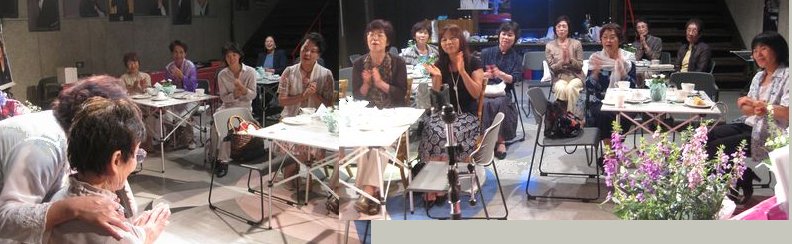 | 皆さんに記録として残したヨンジュンさんへの想いのファイルを見ていただきながら、ティータイムです。今日のお菓子はアールグレイ(Long Walk)の香りが一杯のMiss Paddingtonさんのシフォンケーキです。皆さん、「天使のささやき」を確かめながら食べていらっしゃいます。 |  |