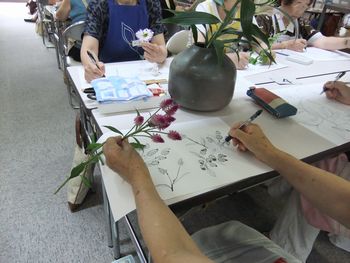 | テーブルに6人ずつ座ります。中央の花瓶に、色々な種類の花があり、その中から好きなお花を選んで、スケッチをします。 |  |