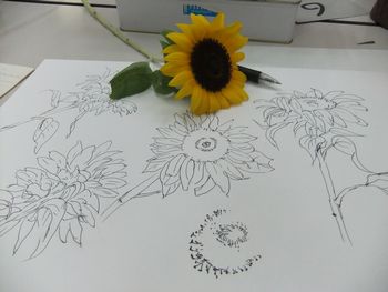 |  | 私は黄色いひまわりを選びました。元気の良い花びらや葉の反り具合がおもしろいと思いました。 ひまわりをくるくるまわして、上から正面から、横から、裏からと、スケッチしました。 |