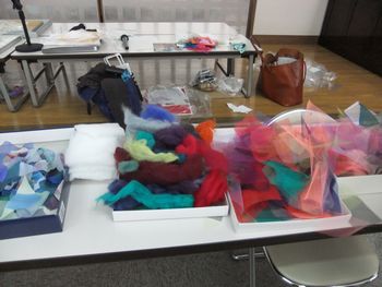 | その中から、選んで、デザイン化していきます。ここが難しかったです。その後、台になる布にひまわりの印象深い所をイメージしながら用意された様々な素材の布で、デザインをおいていきます。 ここで、一日目は終了です。 友達4人で、ホテルへ行きました。 |  |