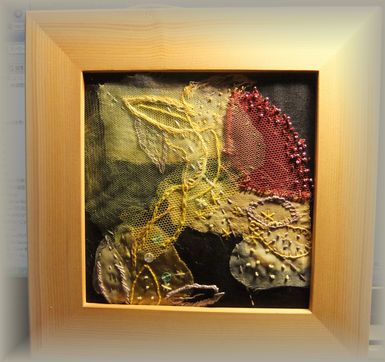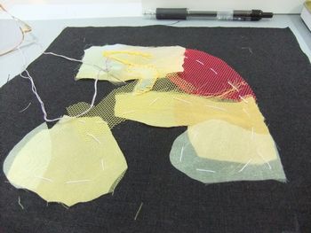 | 講習会二日目です。私の描いたひまわりは、こんなデザインになりました。黒の土台の布の上に、ひまわりの芯、黄色い花びらをイメージして、ジョーゼットやネットになった生地をおいていきます。 その上から、刺繍の様々なステッチで止めたり、ラインを入れたり、ノットを入れたり、飾りながら、とめていきました。 |  |