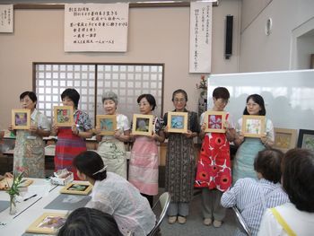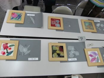 |  | 時間が足りなくなって、一生懸命刺していきました。出来上がったので、額に入れてみます。 3時からは、作品の合評回です。テーブル毎に並んで作品を 見ていただきます。中央は大分の荒木さんです。黒地にひまわりをイメージして刺しています。 |