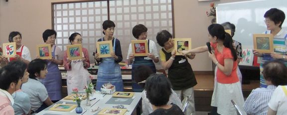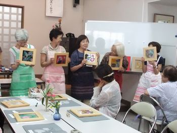 |  | 皆さん、素敵な作品が出来上がっていました。一生懸命に作った作品です。先生のアドバイスの一言で、インパクトのある作品になっていきます。創り上げるって本当に楽しいですね。 夕焼け雲が最後の輝きを見せる頃、大分へ帰りました。 |
