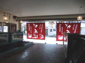 | 島原に着いて、昼食です。島原友の会の方に教えて頂いた海の側の食堂は、大きな水槽が幾つもあり、かにや海老、ひらめ、タイなど魚がたくさん泳いでいました。 |  |