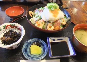 |  | 注文したのは海鮮どんぶり、大きな器に10種類のお刺身がのっています。あまりのボリュームと、その新鮮さ、おいしさに感動してしまいました。これで800円、本当に豊かな海の幸に驚きました。 |