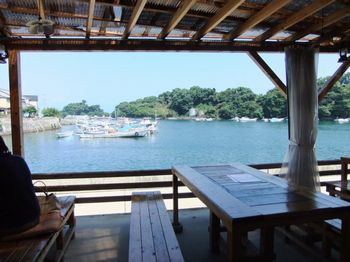| 食堂には、海に面したテラスの席もあり、漁船がたくさん並んでいるのが見えます。とても美しい海、小島の緑、のどかな景色です。 |  |
