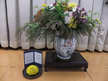 | 会場のステージに活けられた美しいお花です。 ≪重陽  菊尽くしで願う不老長寿の夢≫ 九月九日は、重日思想により古代中国江は厄除けの行事を行ったと伝えられています。九は最大陽数、天の数である、九がかさなることから、いつしか大変良い日と考えられるようになりお祝いの日となりました。 『重陽の室礼』 |  |