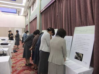 |  | 15日、 部会一日目の休憩時間です。展示した80周年のパネルや、各地の月報を熱心に読む出席者です。 |