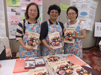 | 沖縄友の会は、10年にわたって勉強をしてきた琉球料理を80周年を記念して、立派なレシピ本としてまとめました。13日に出来上がったばかりという本を、紅型のエプロンをつけて、紹介・販売しています。 |  |