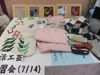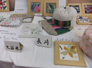 |  | 展示は、夏休みに自由学園工芸研究所から講師を招いて勉強した、生活工芸の作品と、高年会員が若い人たちへ伝えた物を持ち寄りました。 福岡友の会の展示は、工芸の展開で学んだ手提げ、座布団とひざ掛け、パジャマ、若い人に持たせたいソーイングセットなど。 |