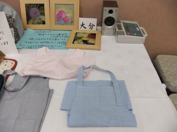 |  | 大分の作品は、子どものためのエプロンの講習会をしました。そこから、小学生のエプロンは、すプレゼント用に70枚ほどの注文も受けています。 どの作品も、若い家庭がそれらを身に置くことで、生活が良い方へ変わると思う作品でした。 |