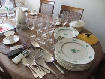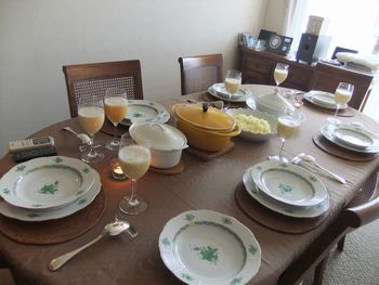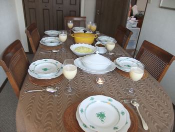 | やりかけのことも、ほぼ目途がついたし、早速「行きます」と返メールを打つ。お友達のお料理の先生・鈴木さんの家です。たくさんの調理器具が整然と置かれ、テーブルは既にセッティングが終わっています。 |  |