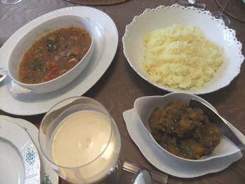 | 黄色いターメリックライスに、左はえびカリー、右下は、かぼちゃのカリー、そして、飲み物はラッシーです。スニータがミキサーを使って作りました。 |  |