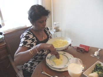 |  | 今日はこれから名古屋へ行くというスニータさんは大忙しです。 さあ、頂きます!です。ラッシーで乾杯しました。 そして、スニータさんが、こうして食べますよ、と見せてくれています。 |