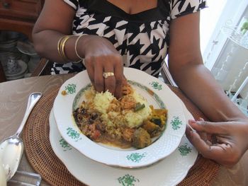 | お皿にターメリックライスを盛り、周りに、お好みのカリーをおきます。 そして、右手の指で、ごはんとカリーを混ぜ混ぜして、右手で掬うようにして、口に運びます。 私も真似してみましたが、これって結構難しいです。スリランカでは赤ちゃんの時からこの食べ方ですものね。貴方はスプーンでどうぞ!と言われてしまった。 |  |