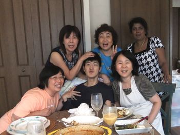 | 鈴木先生のお子さんのTAKEちゃんを囲んでスニータさんと記念写真です。右はスニータさんと、鈴木先生のお料理の生徒で友人のKEIKOちゃん、友人のTEKOちゃんです。 | |