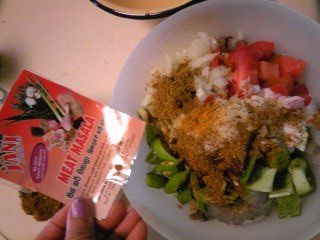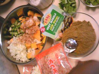 | スニータさん配合の「ベジ・マサラ」を使って、野菜カレーが出来ます。隠し味に削りかつおを使うのは、日本大好きのスニータさんの日本人への気配りです。 |  |
