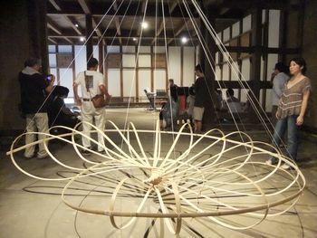 skin」です。 場所は大分市戸次の帆足本家富春館・酒造蔵、竹の作品展と、ピアノのコラボです。 大きな竹の造形が、酒蔵の天井から吊るされています。 |