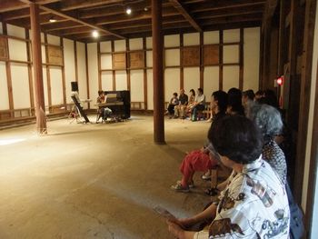 |  | L字型の広い広い酒蔵でコンサートです。周りに椅子をおいて、大勢が聞いています。広い酒蔵に、美しい音楽が流れます。 里の秋、赤とんぼ、など秋の雰囲気の歌が素敵です。 |