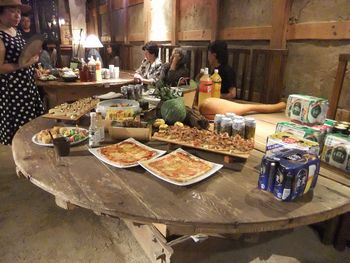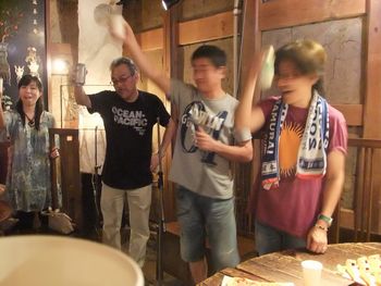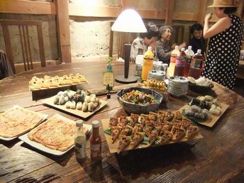 | 蔵作りの喫茶では、今から、オープニングパーティが開かれます。演奏会を聞いた方々が大勢参加しました。酒樽のふたを使った大テーブルには、たくさんのご馳走が並びました。 |  |