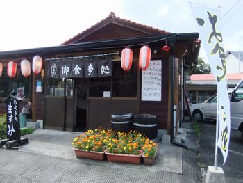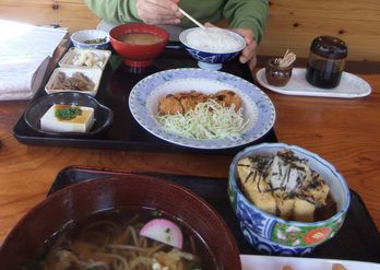 | こんなお店のお食事はおいしそう!と、昼ごはんを食べることにする。まだ1時前だのに、メニューのあれこれが出払っている。きっとおいしいんでしょうね。 夫はトンカツ定食、私は蕎麦と稲荷セットに揚げだし豆腐を追加、お豆腐も蕎麦の味もおいしかったです。 |  |
