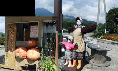 |  信号機の下に立ってた母子のかかし、側には大きなかぼちゃ。 | |