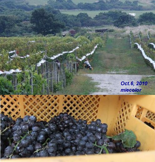 |  久住ワイナリーにやってきました。丁度葡萄の収穫期でした。 葡萄は手で収穫なんですね。摘まれた葡萄は、ちょっと小粒。 来年の3月にはおいしいワインになってお目見えするとか。楽しみです。 | |