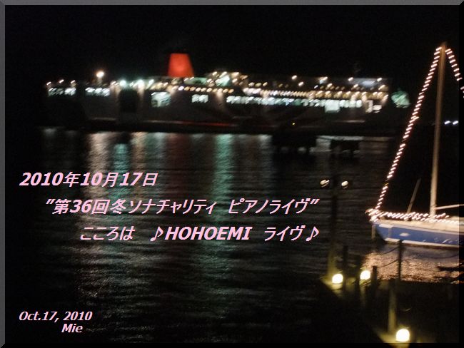 無事に第36回冬ソナチャリティライブが終わりました。スタッフ、お友達、力を合わせて会場片付けです。そして、2階で打ち上げをしました。 外は、真っ暗な海に、丁度神戸行きのフェリーが出港するところで、ライトが美しく波に揺れていました。 |