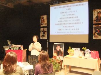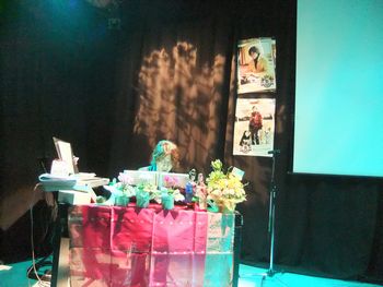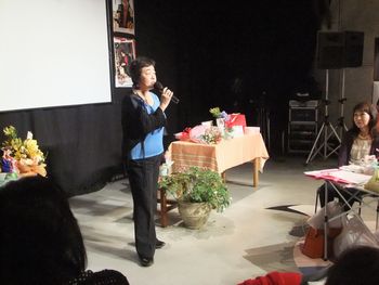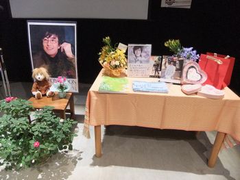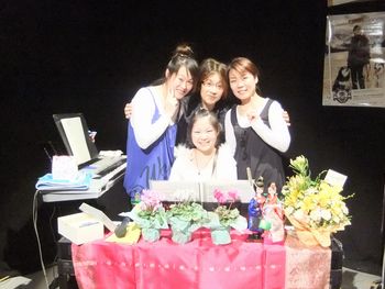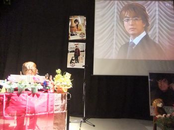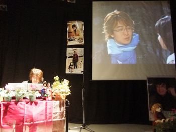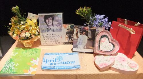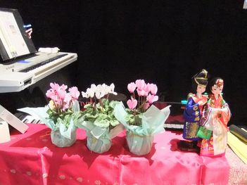 | ステージには、いつものヨンジュンさん席、そして、のテーブルには10月13日にお誕生日を迎えられた深田ミニョン宏一さんへプレゼントの花篭、そして、ヨンジュンさんへ差し上げた「ミニハナヨ」のレプリカを飾りました。 | ![]() |