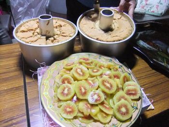 お茶の時間です。シフォンケーキマロン味が配られます。皆さん、珍しいルビーキィウイに驚かれています。 |