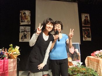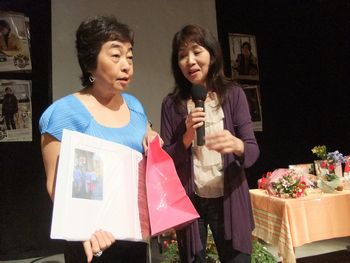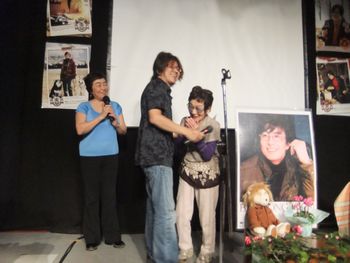 | 「大分から熱くぺ・ヨンジュンさんを思う会」の我らが希望の星・千津子さんからプレゼントがありました。「ありがとうございます」と深田ミニョンさんの優しいハグです。 Mieからも、「四月の雪」特製のスポーツタオルをプレゼント、 そして、Miss Paddingtonさんからは素敵なお花のアレンジメントをプレゼント。 会場の皆さんで、「Happy Birthday !」を歌って、お祝いをしました。 |
