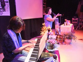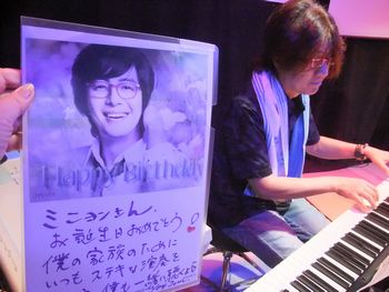 Miss Paddingtonさんが歌います。「Tha Rose」心を篭めた歌声は、会場に感動を呼びました。 昨年のMiss Paddingtonさんから深田さんへの誕生日プレゼントの Arnaldo Bassiniの濃紺のシャツがとてもお似合いのミニョンさんです。 |