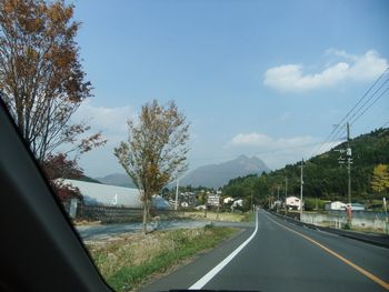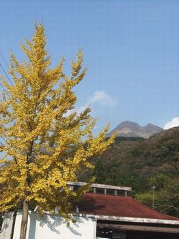 | 青空に黄色くなったイチョウの木が聳えています。 由布岳がツインピークスを覗かせています。 |
