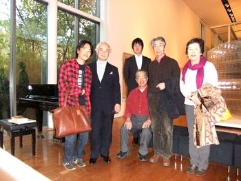 バッハとクープランの曲を演奏してくださった今日のコンサートが終わりました。素晴らしい演奏をありがとうございました。 ゆふいん音楽祭の仲間と一緒に記念写真を写していただきました。 小林道夫先生を囲んで、左から松本君、小林先生、佐藤君、永野K(手前)加藤昌邦氏、Mieです。 |