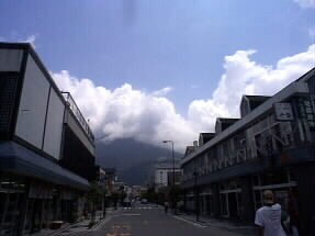 由布院駅を出ると正面に由布岳が、、と今日はちょっと雲に隠れています。でも良い天気です。 |