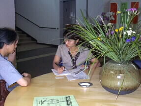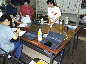 東京から音楽関係のお仕事を専門とされている方々もボランテイアとしてゆふぃん音楽祭に駆けつけて下さっています。本番前には、パソコンも活躍しての綿密な打ち合わせが続いています。 |