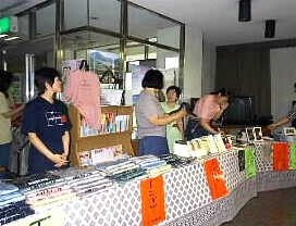 こちらは売店です。音楽祭特製のTシャツとコーヒーカップを売ってます。Tシャツは今年24回目の音楽祭、24という文字が素敵です。毎年買って下さるお客様もあります。カップはゆふいん音楽祭という文字が金色で入っていてとてもかわいいカップです。また、出演して下さっている音楽家のCDや著作もお売りしています。 |
