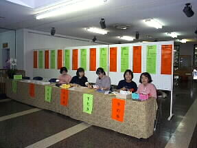 受付準備完了!電話やはがきやEメールで予約して下さった方々のチケットも準備出来ています。当日チケットもスタンバイ。渡辺和さんの解説がとても楽しいプログラムは1部200円。小さいお子様連れのお客様には、エチケットカードも配ります。受付もてきぱきとにこやかに応対、音楽祭特製のTシャツがカラフルできれいです。 |