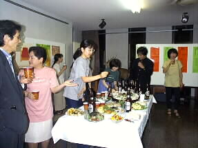 夜の9時です。 座りきれないお客様をお迎えしての「前夜祭」が楽しく終わりました。そしてウエルカムパーテイがロビーで始まりました。音楽祭代表の溝口薫平氏と乾杯のチェンバロの小林道夫さんとお嬢様です。右は実行委員長の加藤昌邦氏。 |