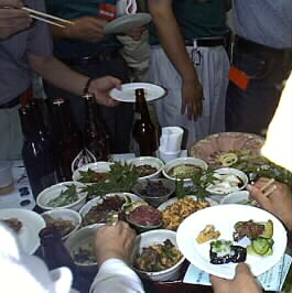 テーブルの上には音楽祭に協賛して下さっている湯布院の旅館ご自慢のおいしいお料理がたくさん並んでいます。豊後牛、地場の有機野菜のお料理、ごま豆腐、どれもこれも湯布院の味。 |