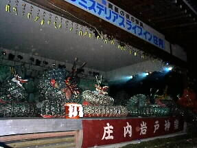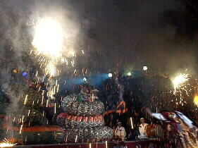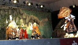 ![]() やがて、スサノウノミコトがやってきて、酔っている大蛇を退治します。しかし大蛇も黙って打たれてはいません。体中から火を噴いて抵抗をしています。口から花火が飛び出し、仕掛けの爆竹がなり、花火が炸裂してスモークはたかれるし、それはそれは素晴らしい舞台でした。 |