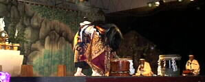 ![]() 次の演目は「大蛇退治」有名なヤマタノオロチの話ですね。おじいさんとおばあさんが、美しい娘(クシイナダ姫)を連れて悲しんでいる。恐ろしい8つの頭を持つ大蛇が暴れるのでこの娘を差し出しに来たと言う。そこへやってきたのは、タカマガハラを追放されたスサノウノミコト。いい考えがあるから心配しなくてもいい。喜んで舞を舞って3人は去って行きます。 |