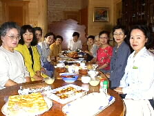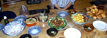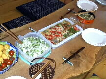 |  | 食事の前に記念写真です。手前は、デザートのなしと、豆腐入り白玉団子、紅茶ケーキ、アップルケーキ。 |