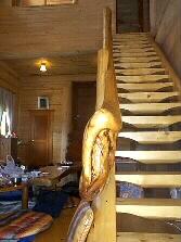 |  | 家中、木の香りが満ちています。2階へ上がる階段の手すりがまた何ともいえない、自然の木のおもしろい形をそのまま生かして使ってあります。 |