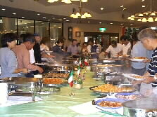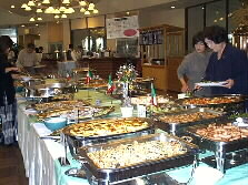|    ビュッフェスタイルのメニューです。今はイタリアンフェアーということで、緑、白、赤の三色旗と共に パスタやスープ、チーズやトマトのお料理がたくさん並んでいます。 | |