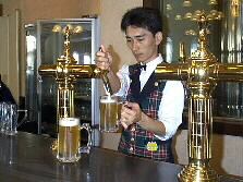 |   | ピカピカに光ったビールコックから出来立てのビールが威勢良くジョッキに 注がれています。ジョッキの上少しに細かいビールの泡を置き、おいしさを 閉じ込める、それがビールを注ぐ秘訣なんですね。 |