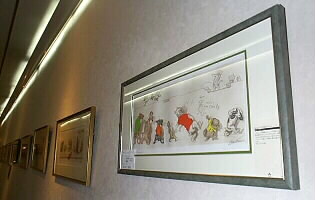 ![]() ゆふいん麦酒館の中の写真をたくさん撮らせてもらって、でもまだ、レストランの順番は来そうにないので、隣の山水館のロビーで休憩をさせてもらいました。正面玄関から入るのではなく、廊下伝いにロビーに出ます。その長い廊下に飾ってあるブルドックを主人公にしたリトグラフが素敵なんです。ロシア生まれのフランス人の画家、ボリス・オクランの風刺画です。順に見ていくととっても楽しい! | |