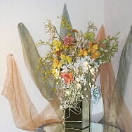 館内のあちこちに飾られている豪華なアートフラワーや アメリカンフラワーは小野社長の奥様の制作だそうです。 秋色がとっても出ていますね。これは、ホテルの電話コーナーの 側で見つけました。 |
